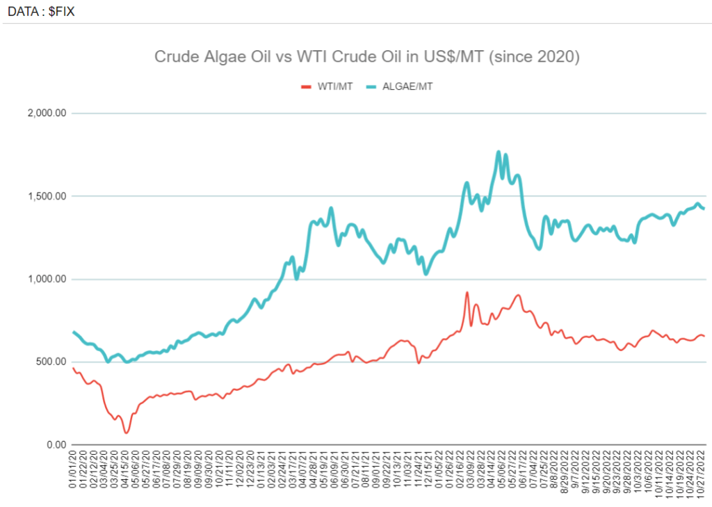 In 2010, the cost of producing a barrel of algae biofuel ranges from $140 a barrel to $900 per barrel. Now (2022) production costs are $20 to $200 per barrel, while market prices are $200 (~$1500/MT) or below. See https://finamatrix.net/fix/