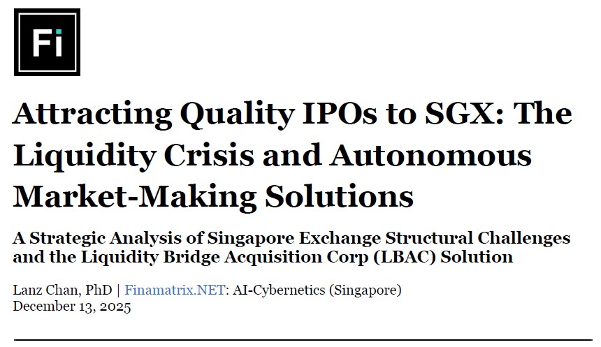 13 Dec 2025: SGX Quality IPO AMM Solution – Dr Lanz Chan is tackling SGX’s core weakness: a severe lack of reliable liquidity and unattractive post‑IPO trading conditions that drive quality issuers and institutional investors to list in Hong Kong or on Nasdaq instead. His LBAC + autonomous AMM + Fi Vault keys architecture is designed to algorithmically guarantee deep, continuous liquidity for IPOs and mid‑caps within the MAS/SGX/CDP framework, so Singapore can credibly compete as a premier venue for biotech, climate, and AI‑driven listings.