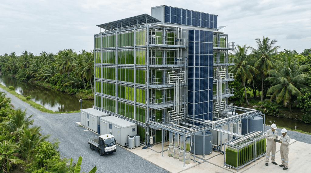 28 Jan 2026: Vertical farm (patent-pending) meets power plant vision – Checking in to the algae-solar tower where the windows EAT CO₂ and the walls PRINT electricity. Liquid sunlight, Solar skin, Biofuel, food, oxygen – all in one tower.